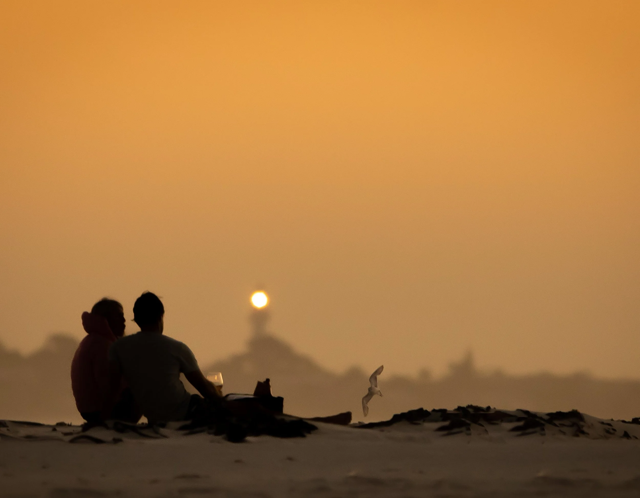 Enjoying a sundowner on Noordhoek beach, with Slangkop Lighthouse in the far distance.